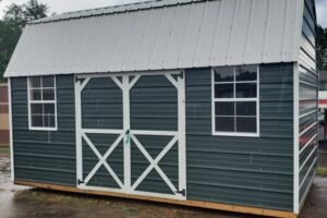 This is a 10×16 Side Lofted Barn with wood siding painted a our Dark Gray, with White colored trim, & a Galvalume metal roof. There’s 2 2×3 Windows with 2 36″ doors for 72″ easy access. It has 160 sq ft plus 80 sq ft in the lofts, which totals 240 sq ft. Listed @ $5195 (Plus Tax) Our Rent to Own pmts are $245 (36 months), $220 (48) & $196 (60). (These Rent to Own Prices Include Taxes)