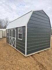 This is a 10×16 Side Lofted Barn with wood siding painted a our Dark Gray, with White colored trim, & a Galvalume metal roof. There’s 2 2×3 Windows with 2 36″ doors for 72″ easy access. It has 160 sq ft plus 80 sq ft in the lofts, which totals 240 sq ft. Listed @ $5195 (Plus Tax) Our Rent to Own pmts are $245 (36 months), $220 (48) & $196 (60). (These Rent to Own Prices Include Taxes)