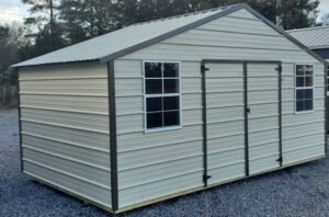 (Shown above) features 2 3′ shop built doors on the front (wide side of the building). This one normally has windows on each side of the doors, but are not required. Without ’em, the low price on this building gets even LOWER. They have our Light Stone Metal Roof & Siding, & Burnished Slate Trim. There’s 2 36″ doors providing 72″ of easy access, and offers a lot of storage space at a great price. Furthermore, they’re constructed using 29 gauge metal, & has a manufacturers warranty of 20 years. In addition, they’re built with 2 x 4 studs notched into the 4×6 pre-treated skids underneath. Moreover, the flooring system above comes with a 10 year manufacturers warranty!