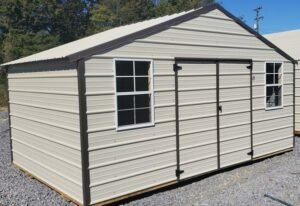 (Shown above) features 2 3′ shop built doors on the front (wide side of the building). This one normally has windows on each side of the doors, but are not required. Without ’em, the low price on this building gets even LOWER. They have our Light Stone Metal Roof & Siding, & Burnished Slate Trim. There’s 2 36″ doors providing 72″ of easy access, and offers a lot of storage space at a great price. Furthermore, they’re constructed using 29 gauge metal, & has a manufacturers warranty of 20 years. In addition, they’re built with 2 x 4 studs notched into the 4×6 pre-treated skids underneath. Moreover, the flooring system above comes with a 10 year manufacturers warranty!