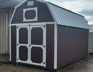 This is a 10×16 Wood Lofted Barn at our Louisville location finished in Mahogany Urethane. It has a Galvalume Metal Roof & White Trim. Listed at $4,995.00, & discounted 5% to $4750. Rent-To-Own payments start at $188 for 60 months, $211 for 48 or $235 for 36! There’s 2 36″ double doors for 72″ of access. It has 2 4×10′ lofts which add another 80 sq ft of storage for a total of 240 sq ft.