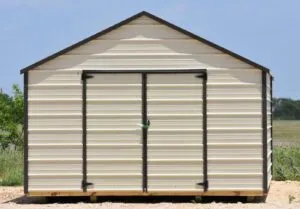 This 12×16′ standard metal storage shed (Shown above) features 2 3′ shop built doors for 6′ of easy access on the 12′ (End) side of the building. It’s listed for only $3795 plus tax, and the Rent to Own options begin at $175.69 for 36 months, $158.13 for 48 months, & , $140.56 a month for 60 months (Plus Tax). There may be a special running on this building, or even a repo available, so be sure to ask your dealer.