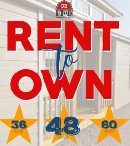 This 8×16′ standard metal storage shed (Shown above) features a 4′ shop built door on the 8′ (End) side of the building. It’s listed for only $2465 plus tax, and the Rent to Own options begin at $114 for 36 months , $102.71 for 48 months, & $91.30 a month for 60 months (Plus Tax). *With our 60 month rent to own option there is a $150 refundable security deposit that must be made with the 1st rental payment.There may be a special running on this building, or even a repo available, so be sure to ask your dealer.