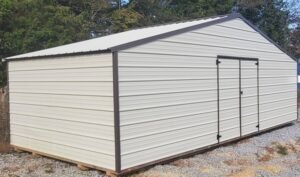 Our 8′ wide Best Value Side Style Storage Sheds has one 48″ shop built door on the front side of the building. Our 10 & 12′ wide buildings have two 36″ shop built doors in the front, or the wide side of the building. The Siding & Roof is Light Stone Metal, along with a Burnished Slate Trim. They offer a lot of storage space at a fantastic price. They’re built with 2 x 4 studs, 29 gauge metal siding and roof, & 16″ centered 2×4′ floor joists set into 4×6″ pretreated notched skids. These buildings are priced with 2 2×3 windows, but they’re not required. Without ’em, the low price on this building will save you even more money! To save even more money, having the doors on the end of the building are even less expensive. The other is with the doors on the front (or wide side) of the building. This one normally has windows on each side of the doors, but are not required. CLICK HERE to see more in this style.