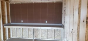 - A work bench across the entire back wall (12′), which sits under a 4′ high Peg Board, which makes a great place to hang up & organize your tools.